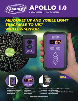 A. APOLLO 1.0 Radiometer/Photometer is a WIRELESS (via Bluetooth) instrument for ACCURATE measurement of UV-A irradiation and visible illumination. Extra engineering effort is taken to make an accurate measurement of visible light emission from a UV-A lamp by incorporating a superior band pass filter stack containing only non-fluorescent filters. The instrument provides fast measurement as it offers auto ranging and concurrent measuring of visible light and UV-A irradiation. Apollo 1.0 is traceable to NIST (US National Institute of Standards and Technology).